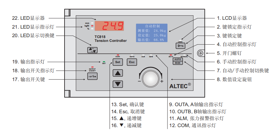 - 当控制器工作在自动控制模式时,自动控制指示灯AUTO)点亮,可旋转数值设定旋钮或按递增键/递减键修改张力设定值,按AUTO/MAN键可切换到手动控制模式。