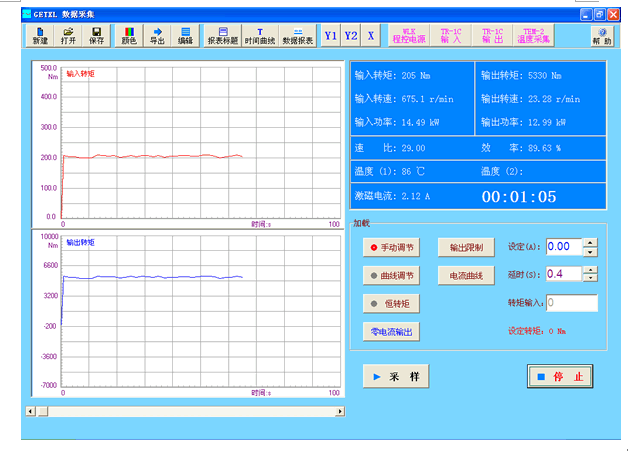 - 所有仪器通过RS485总线与电脑连接,实现对变速箱的自动加载以及对数据的集中采集。实时显示各参数与时间之间的关系曲线,以记录整过测试过程。
